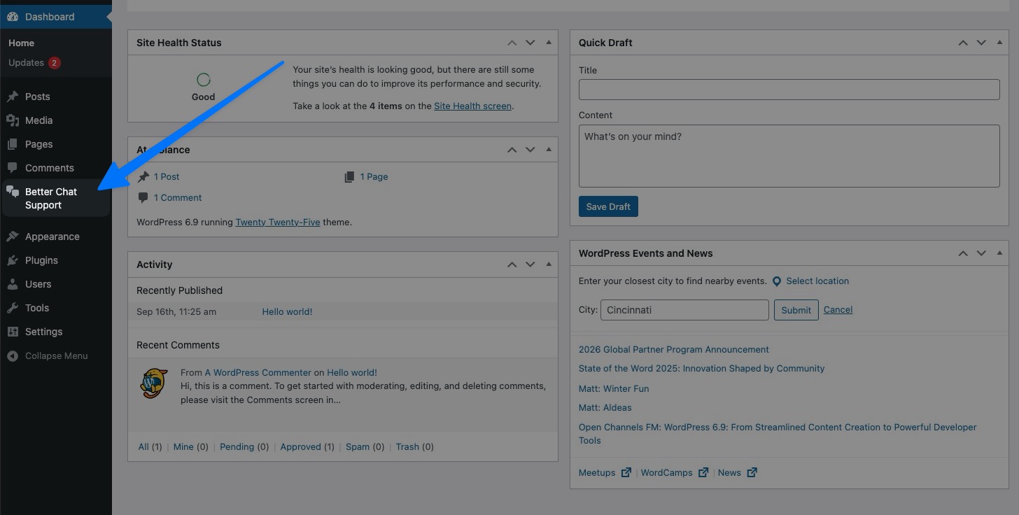 After successful activation of the Greet Bubble plugin, you will be able to see the Better Chat Support menu in your dashboard menu item. With this menu, you will be able to configure all settings for the plugin.