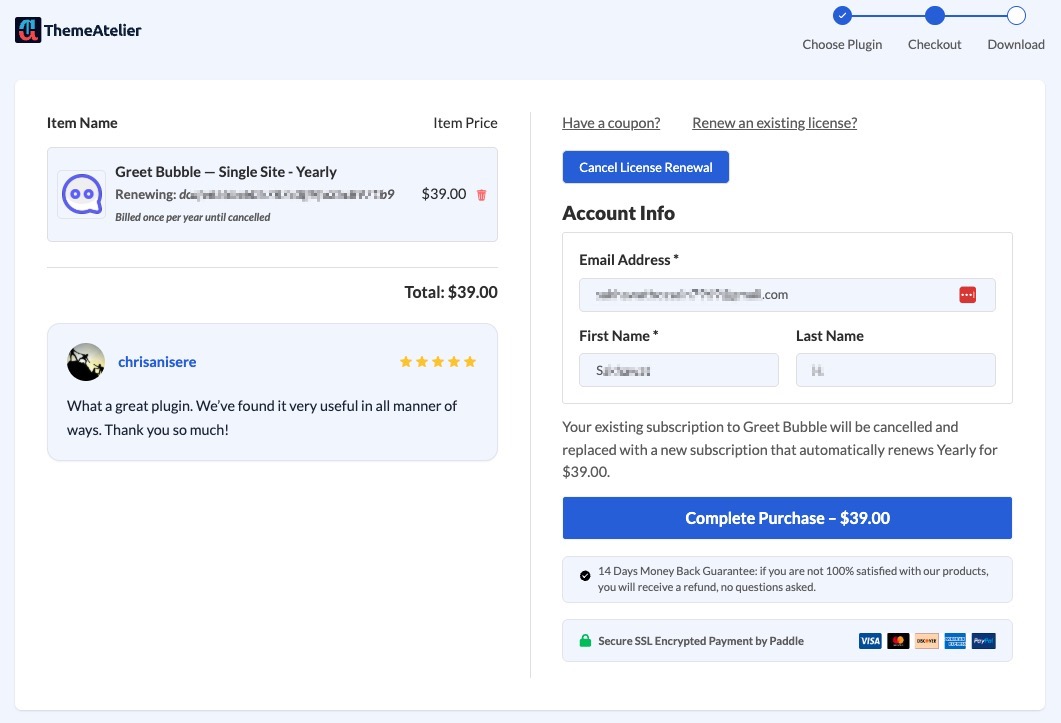 After clicking this renewal button, a checkout page will appear. Here, you will see a notice about “Renew an existing license?” Click on this, enter your existing license key, and click Apply Renewal. Now, choose a payment method and complete the purchase.